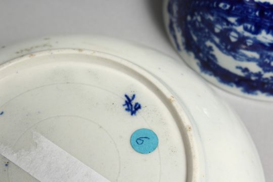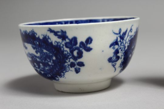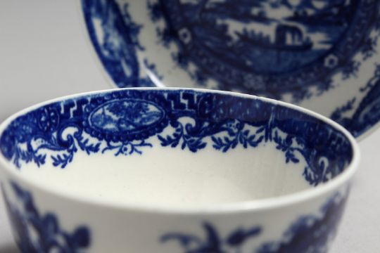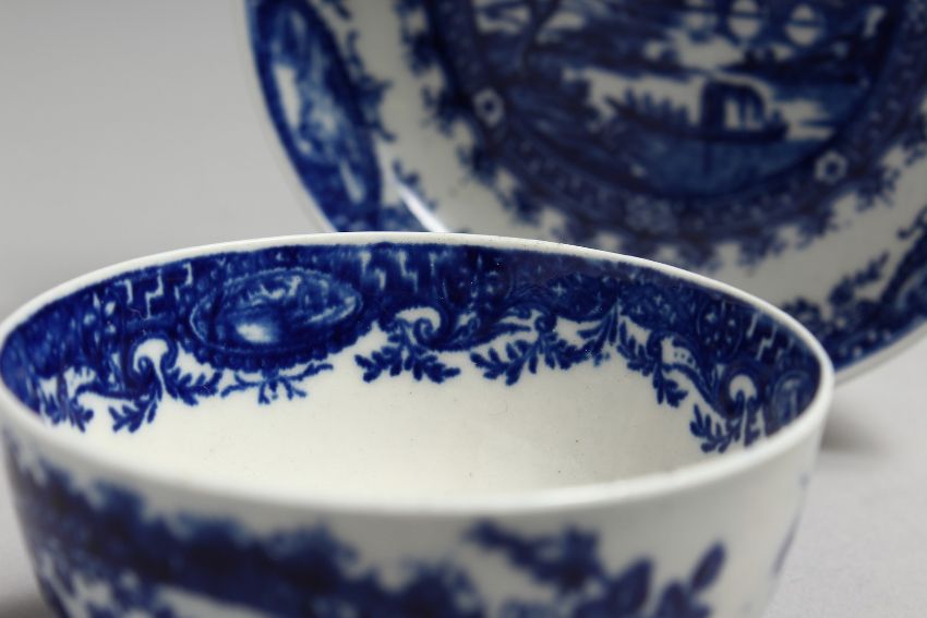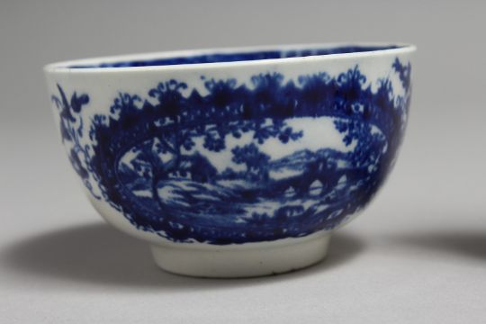 AN 18TH CENTURY WORCESTER TEA BOWL AND SAUCER painted with a landscape painted within a wreath.