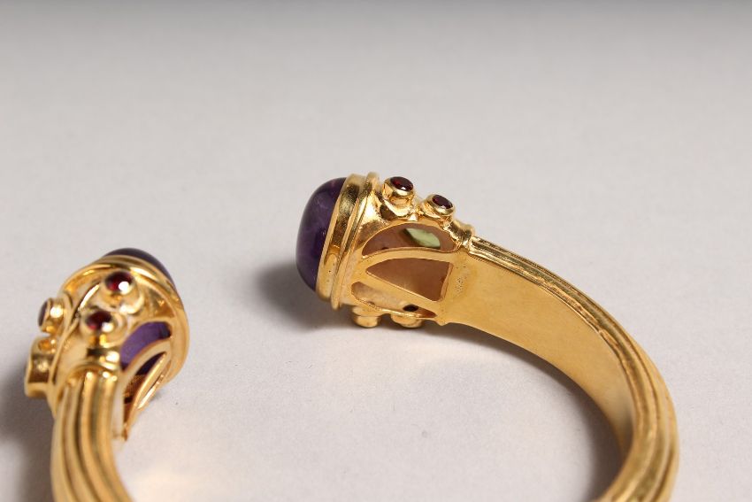 A CABOCHON SET AMETHYST AND PERIDOT BRACELET.