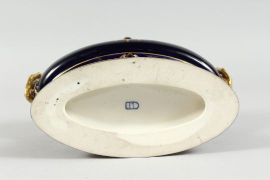A 19TH CENTURY VIENNA PORCELAIN OVAL JARDINIERE, rich blue ground, edged in gilt and painted with ovals of cupids, mark in blue.