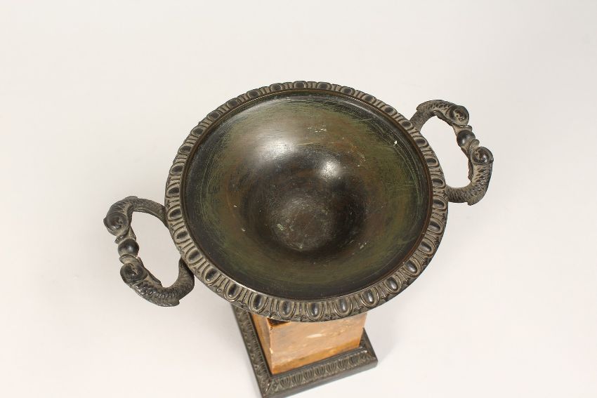 A REGENCY BRONZE TWO HANDLED CIRCULAR TAZZA on a marble plinth