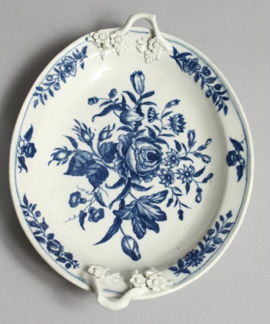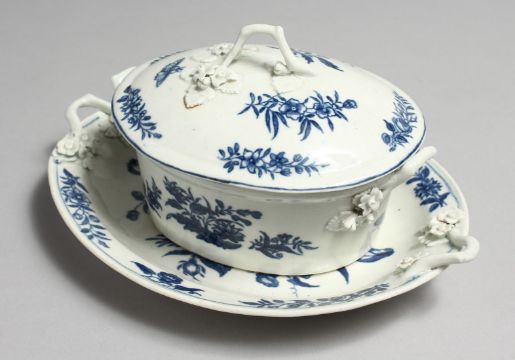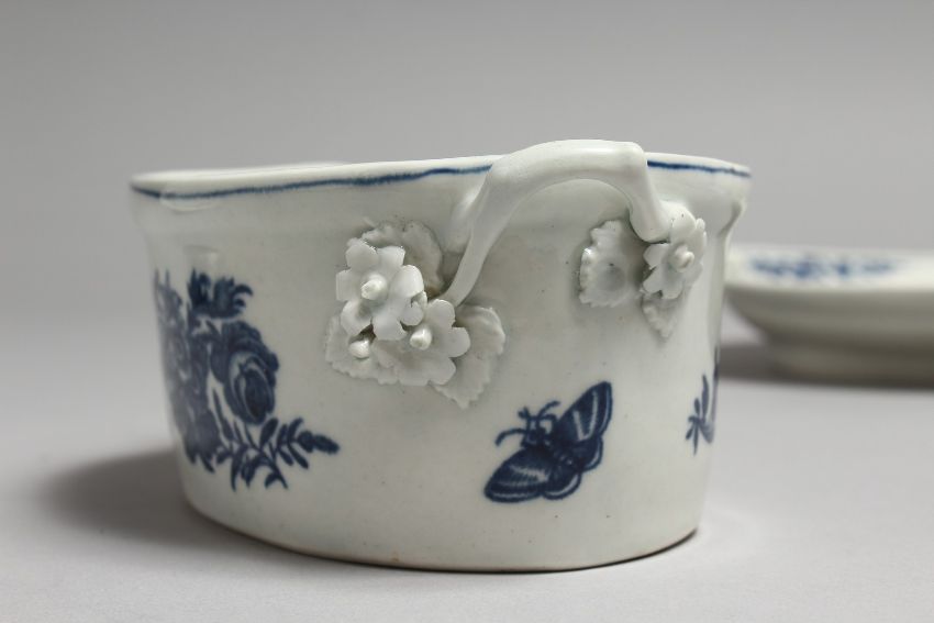 AN 18TH CENTURY WORCESTER FINE BUTTER TUB, COVER AND STAND, with twig handles decorated with roses, floral sprigs and moths, crescent mark.
