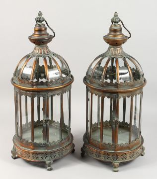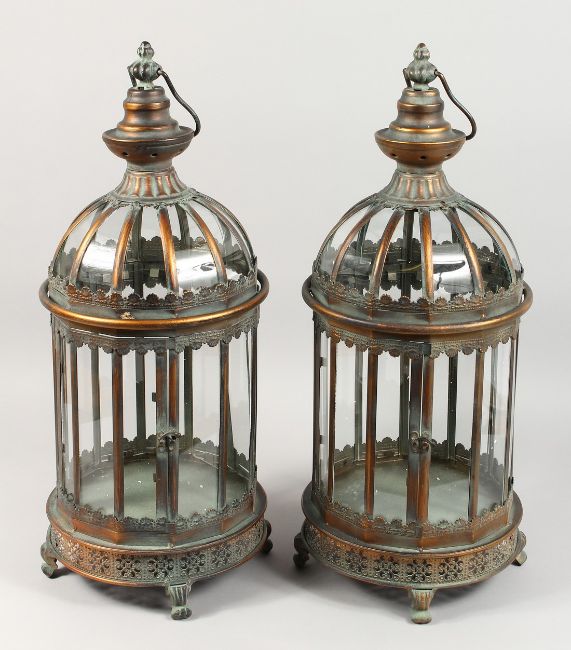 A PAIR OF METAL CIRCULAR HANGING LAMPS.