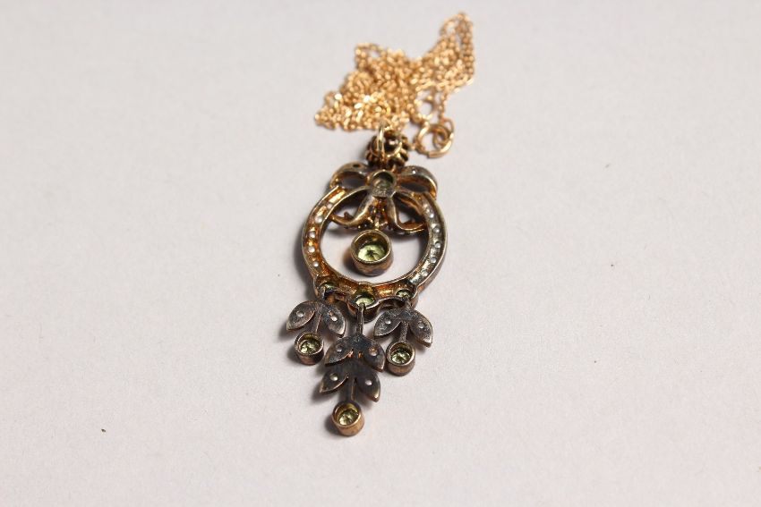 A 9CT GOLD AND SILVER SET PERIDOT AND PEARL PENDANT on chain.
