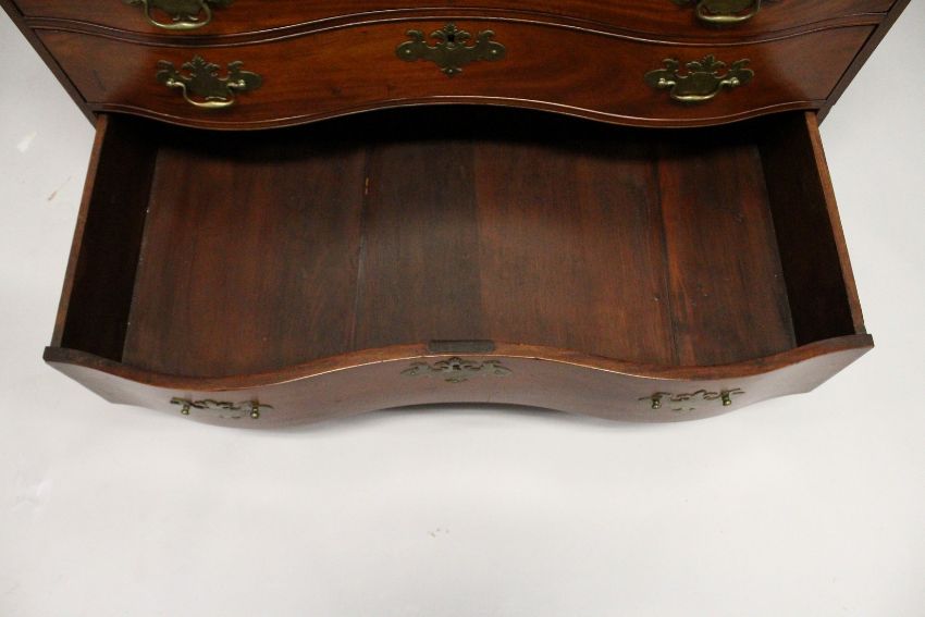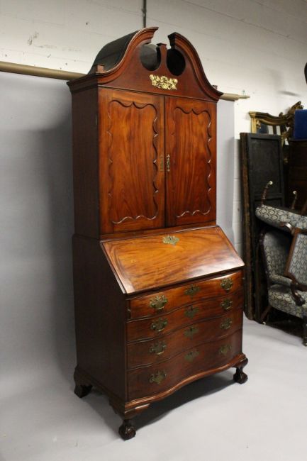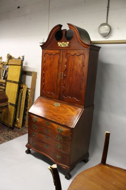 A SUPERB 18TH CENTURY AMERICAN, BOSTON, MAHOGANY, BUREAU BOOKCASE, the top with shaped cornice over double panel doors, the bureau base with folding 'flap opening' to reveal a fitted interior with small drawers and pigeon holes over four legs, shaped graduated drawers wit brass handles and supported on claw and ball feet.
