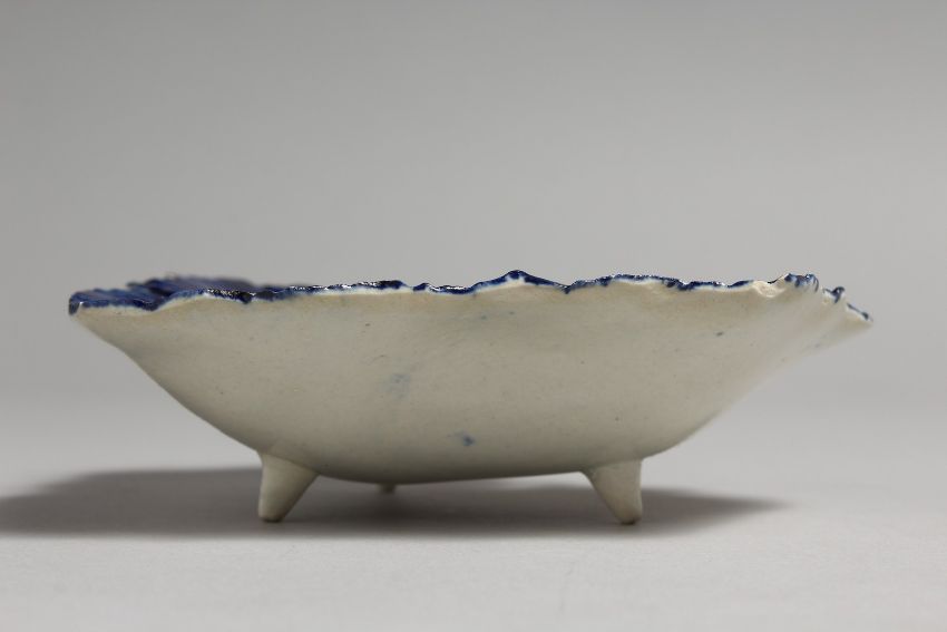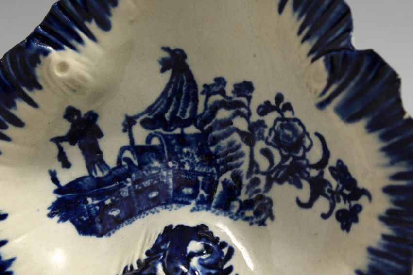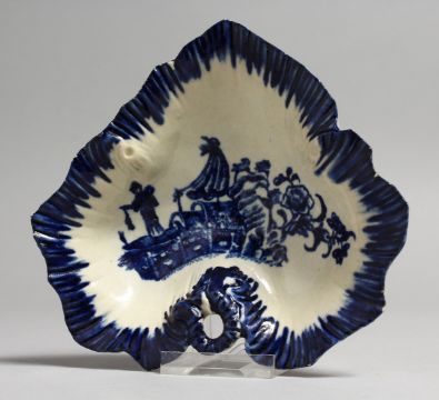 AN 18TH CENTURY LIVERPOOL LEAF DISH, printed with the Fisherman pattern under a blue painted border.