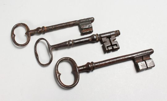 THREE 18TH / 19TH CENTURY CAST IRON KEYS.