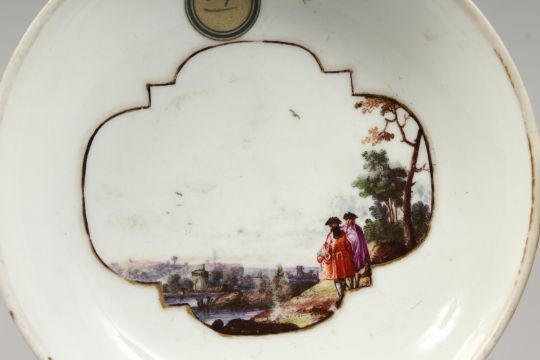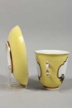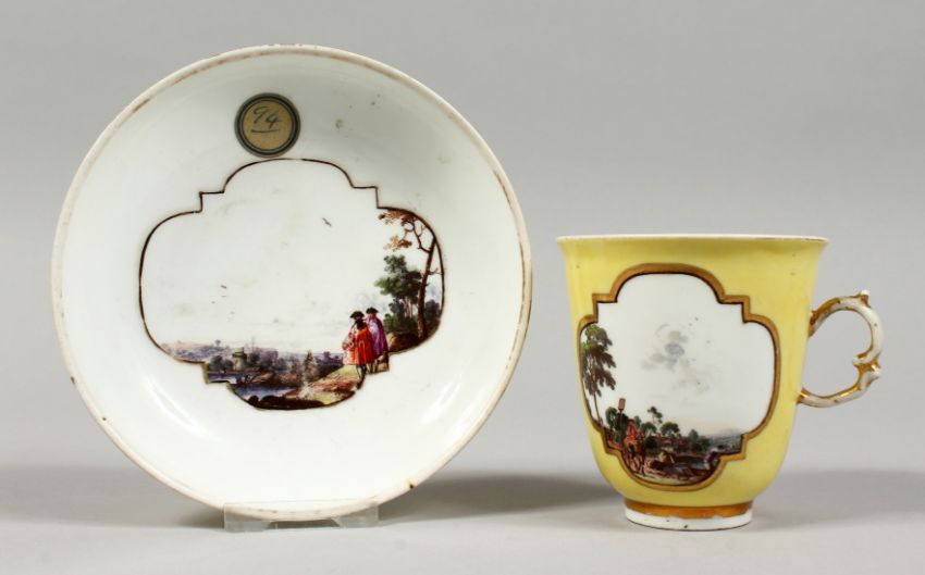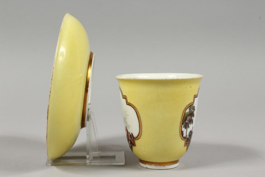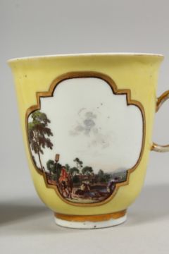 A GOOD 18TH CENTURY MEISSEN YELLOW GROUND CUP AND SAUCER with painted scenes of figures in a landscape.