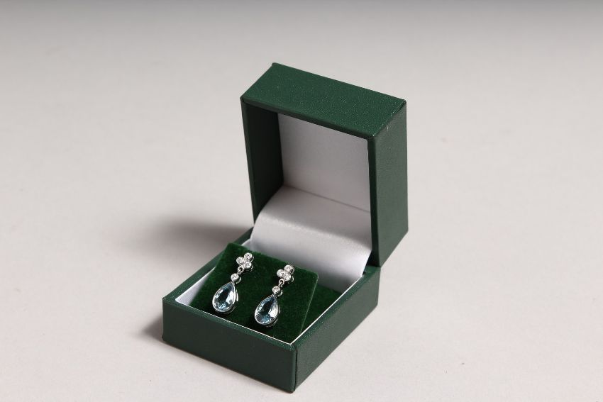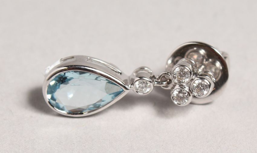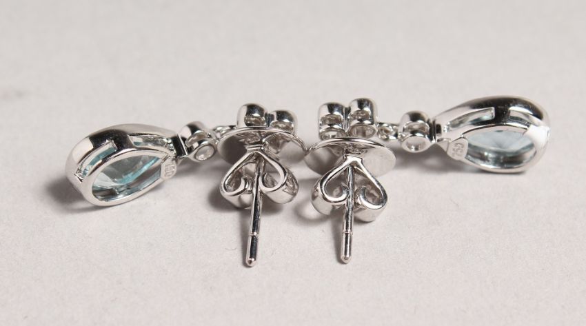 A PAIR OF 18CT WHITE GOLD, AQUAMARINE AND DIAMOND DROP EARRINGS.