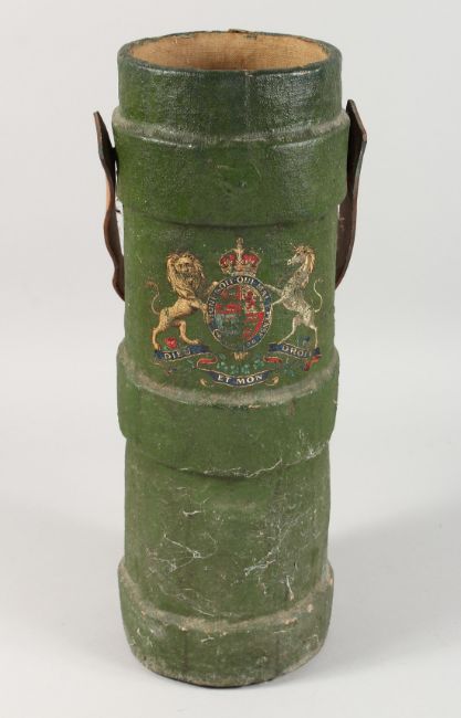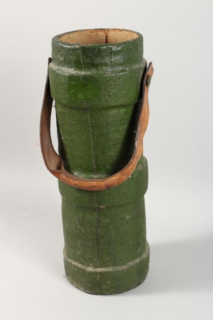 A 19TH / EARLY 20TH CENTURY GREEN PAINTED CANVAS SHELL CARRIER, with leather handle and applied coat of arms.