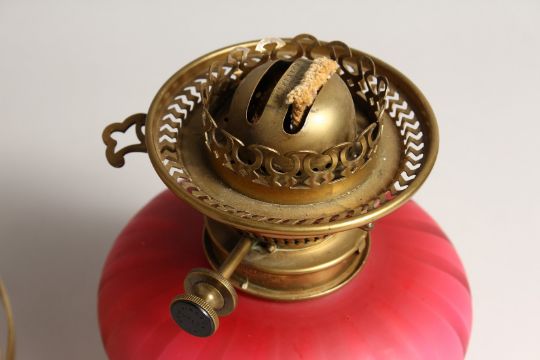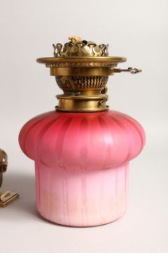 A VERY GOOD VICTORIAN AESTHETIC MOVEMENT BRASS OIL LAMP, with pink lustre glass oil reservoir supported by two bands with stylized leaf and flower decoration, on scroll feet with concave sided platform base, etched glass shade and HINKS & SONS patent mounts