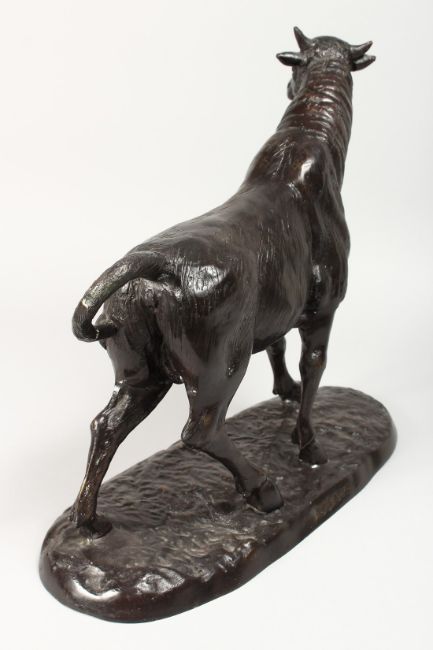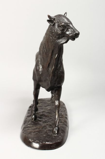 A CAST BRONZE MODEL OF A BULL, standing on a naturalistic base.