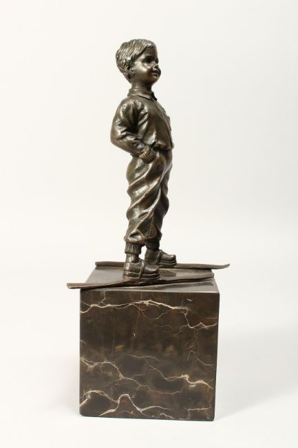 A BRONZE FIGURE OF A YOUNG BOY ON SKIS, his hands in his pockets, mounted on a marble base.