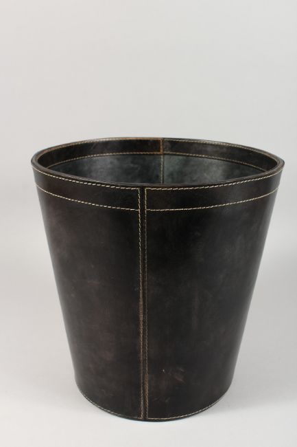 A ROUND LEATHER WASTE PAPER BIN.