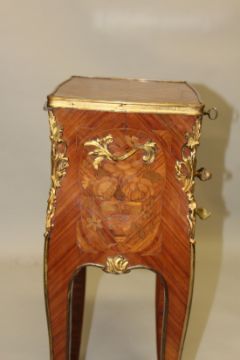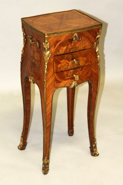 A SMALL 19TH CENTURY FRENCH KINGWOOD AND ORMOLU WORK TABLE, with rising top, two small drawers on cabriole legs.