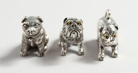 THREE CAST SILVER DOGS.