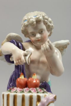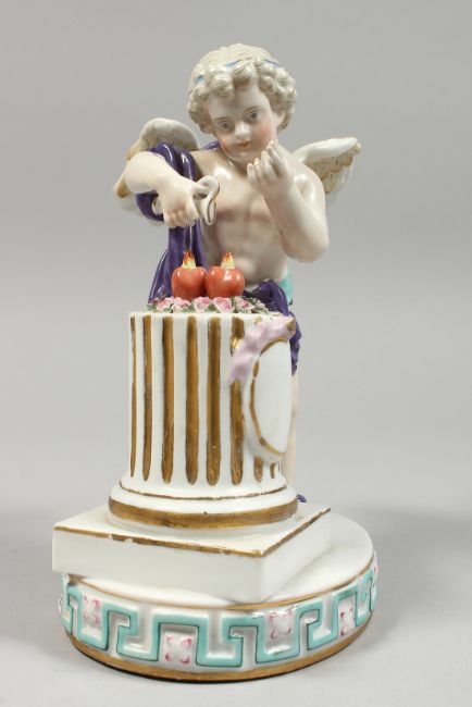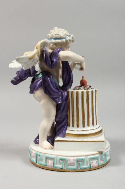 A GOOD DRESDEN PORCELAIN FIGURE OF CUPID setting two hearts aflame