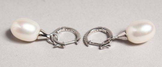 A PAIR OF 18CT WHITE GOLD, PEARL AND DIAMOND DECORATIVE DROP EARRINGS.