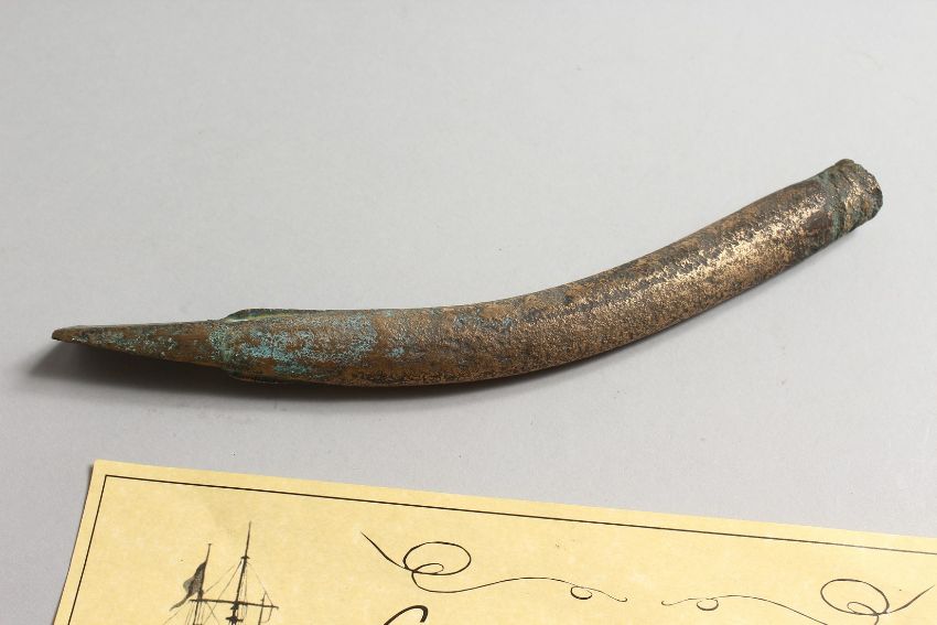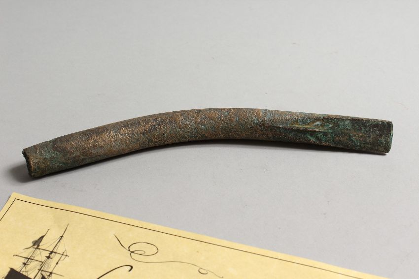 A HISTORICAL BRASS BOLT, 8.5ins long, removed from HMS Victory during restoration.