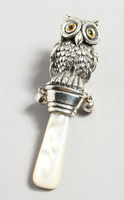 A SILVER AND MOTHER-OF-PEARL OWL RATTLE.