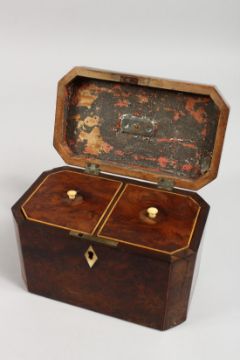 A GEORGE III AMBOYNA TEA CADDY, the hinged lid enclosing two compartments.