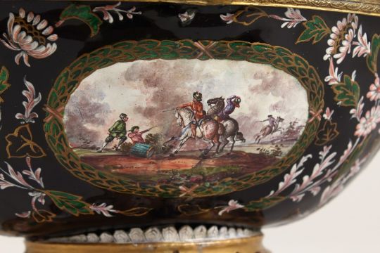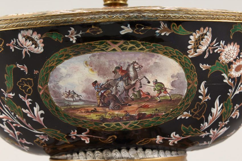 A VERY GOOD 19TH CENTURY ENAMEL CIRCULAR TUREEN AND COVER with various oval and circular scenes, after Wouverman.