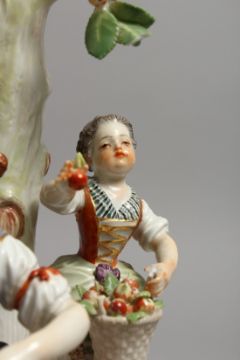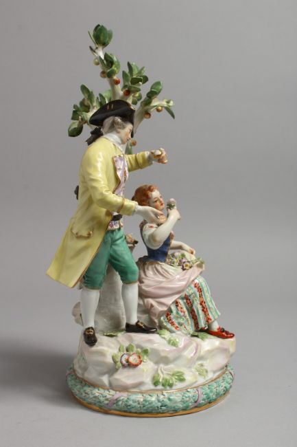 A GOOD MEISSEN PORCELAIN GROUP, a gallant, young lady and girl, with fruit and flowers around a tree.