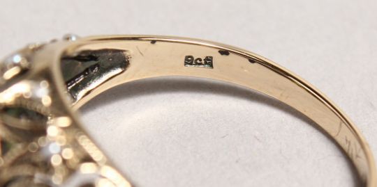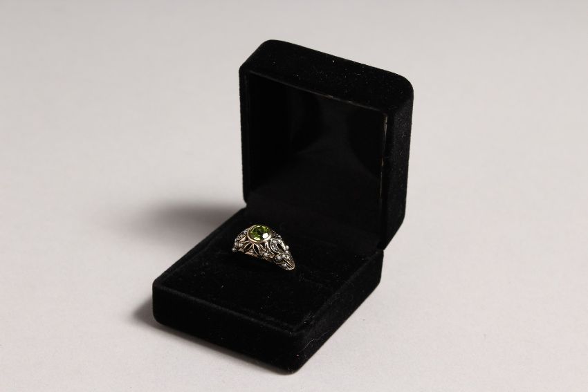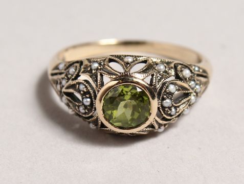 A 9CT GOLD, PERIDOT AND PEARL RING.