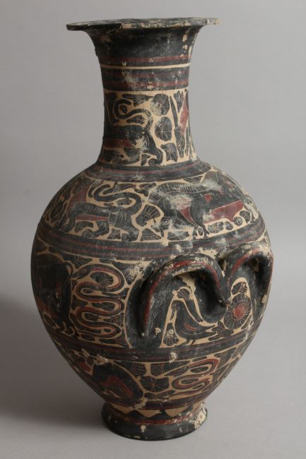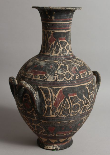 A LARGE EARLY GREEK TWO-HANDLED POTTERY VASE.