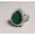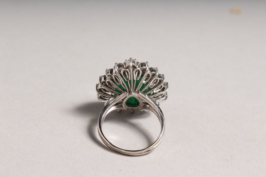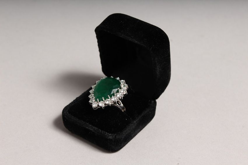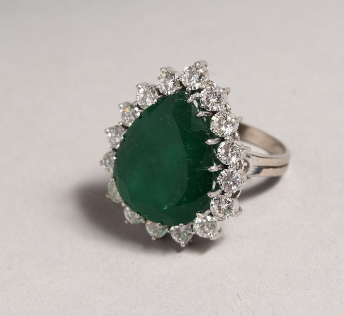 A SUPERB 18CT WHITE GOLD TEARDROP EMERALD RING surrounded by diamonds.