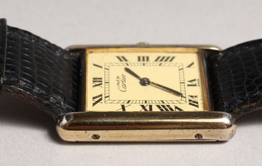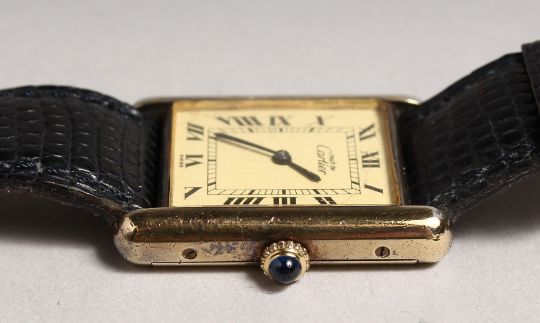 A CARTIER SILVER GILT WRISTWATCH, No. 170837, with leather strap, in a Cartier pouch.