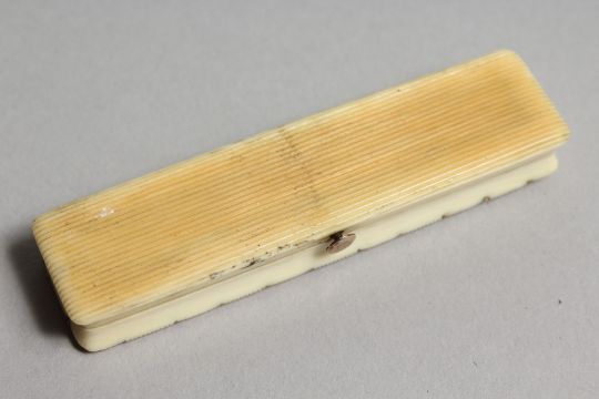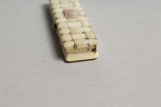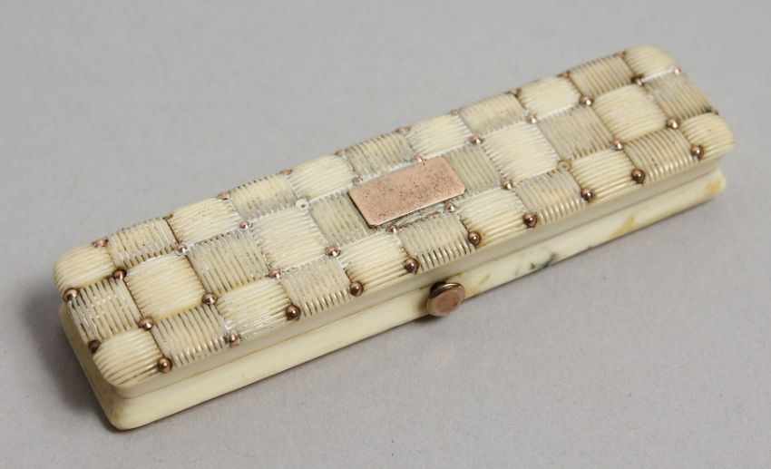 A GEORGIAN IVORY AND GOLD TOOTHPICK CASE, the top with a cushion, the inside with a mirror.