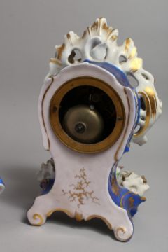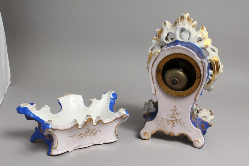 A 19TH CENTURY FRENCH, POSSIBLY JACOB PETIT, PORCELAIN CLOCK ON A STAND, blue and gilt ground encrusted with flowers, the movement by L. MARC, PARIS.