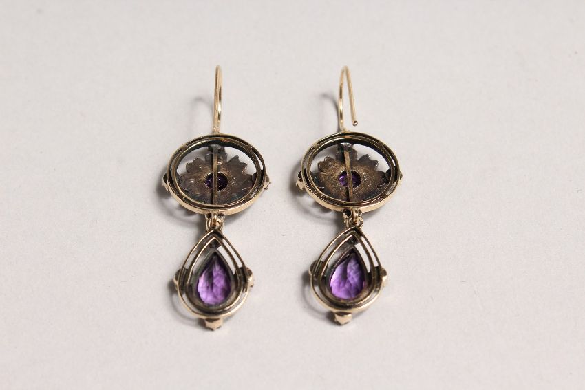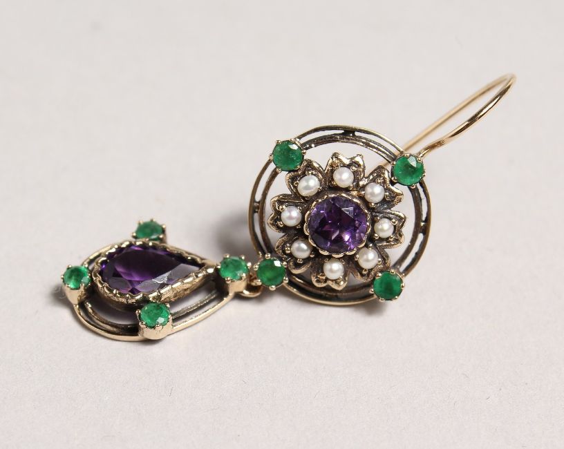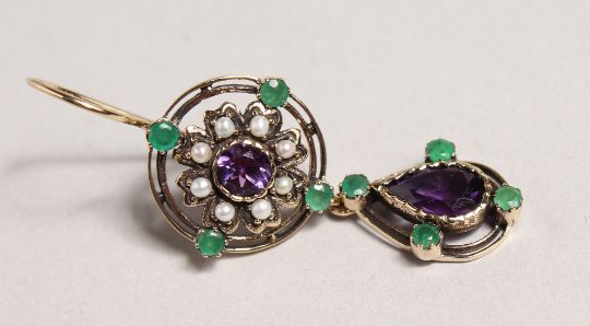 A GOOD PAIR OF SURROGATE COLOURED EMERALD, AMETHYST AND PEARL DROP EARRINGS.
