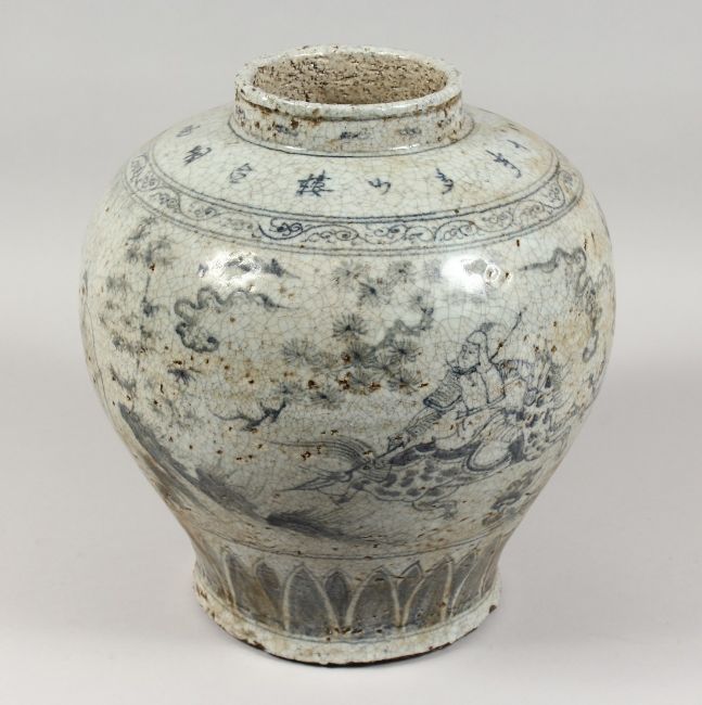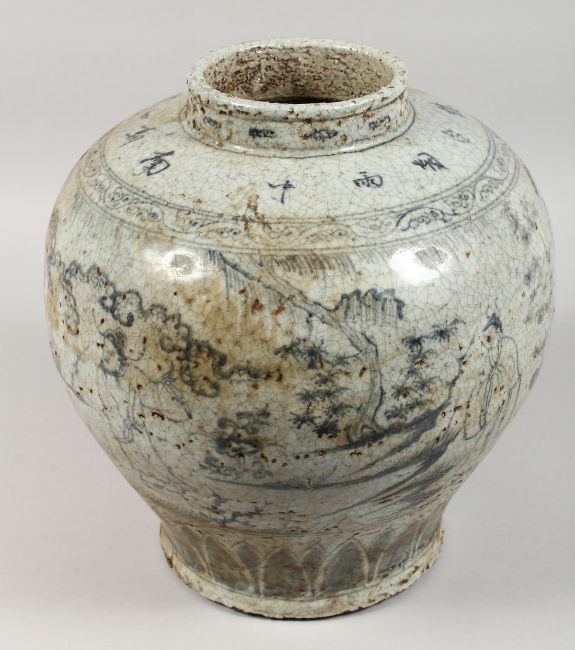 A CHINESE PORCELAIN CRACKLE GLAZE BULBOUS VASE with calligraphy and figures.