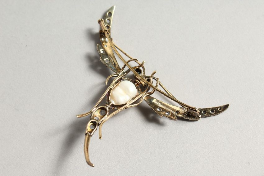 AN 18CT GOLD BAROQUE PEARL AND DIAMOND DRAGONFLY BROOCH.