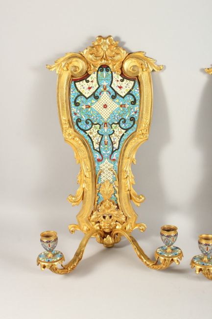 A SUPERB PAIR OF FRENCH, ORMOLU AND ENAMEL TWO LIGHT WALL SCONCES WITH ACANTHUS AND SCROLLS