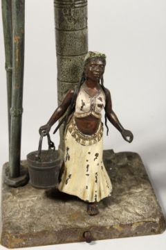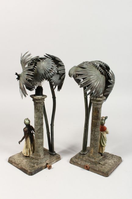 A VERY GOOD PAIR OF VIENNA PAINTED COLD CAST LAMPS, figures standing beside a column and palm trees.