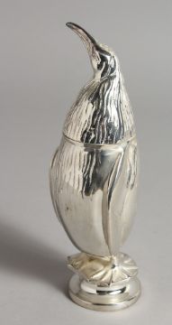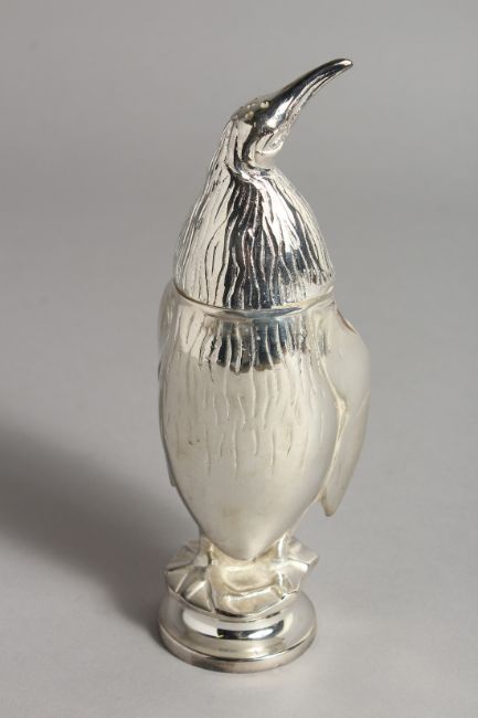 A SILVER PLATE PENGUIN SUGAR SIFTER.