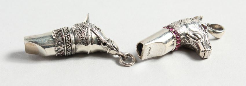 TWO CAST SILVER NOVELTY HORSE'S HEAD WHISTLES.