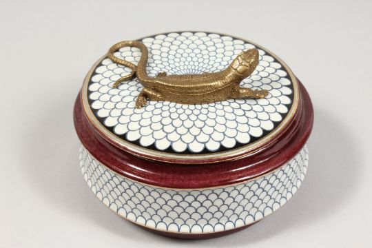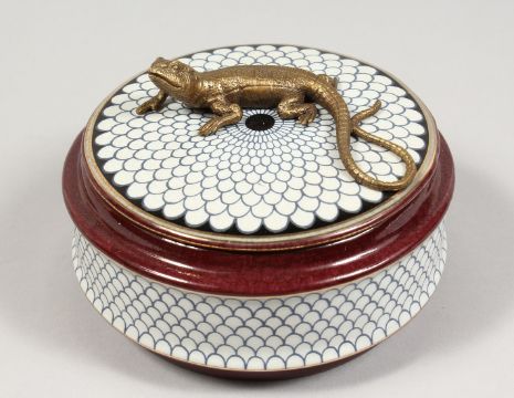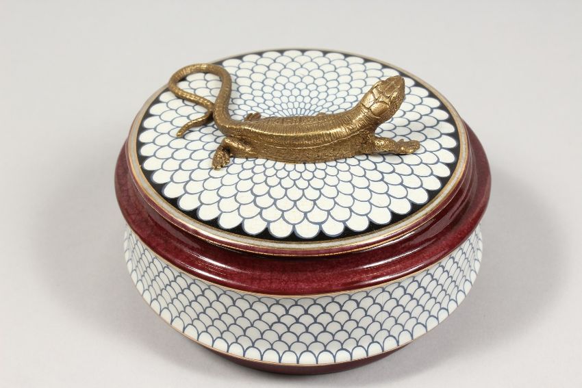 A PORCELAIN BOX AND COVER, the top with a bronze lizard.