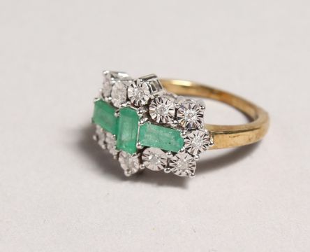 A GOOD 9CT GOLD, DIAMOND AND EMERALD RING.