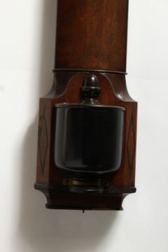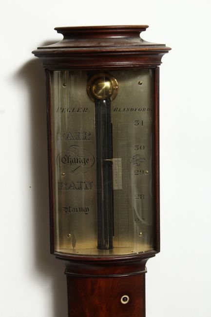 A GOOD VICTORIAN BOW FRONTED STICK BAROMETER by PEGLER BLANDFORD with two silvered dials.