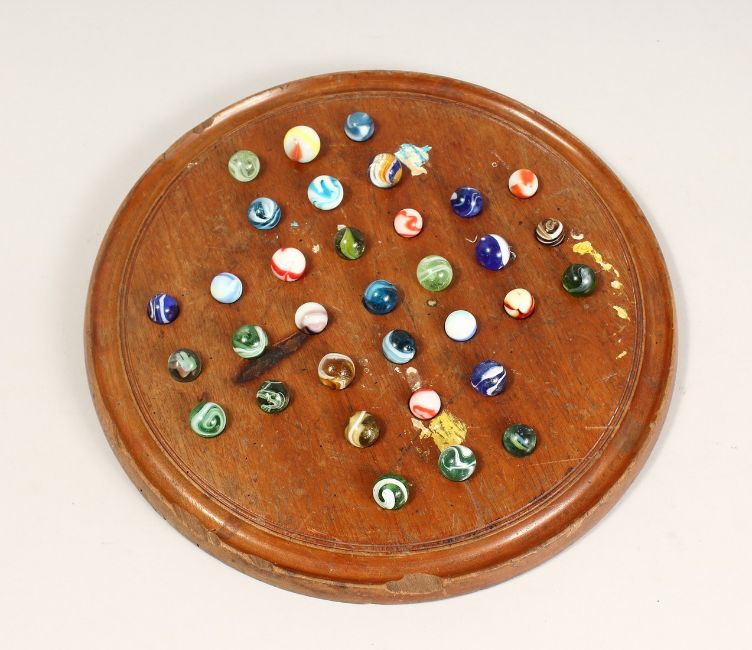 A LARGE 19TH CENTURY MAHOGANY CIRCULAR SOLITAIRE BOARD