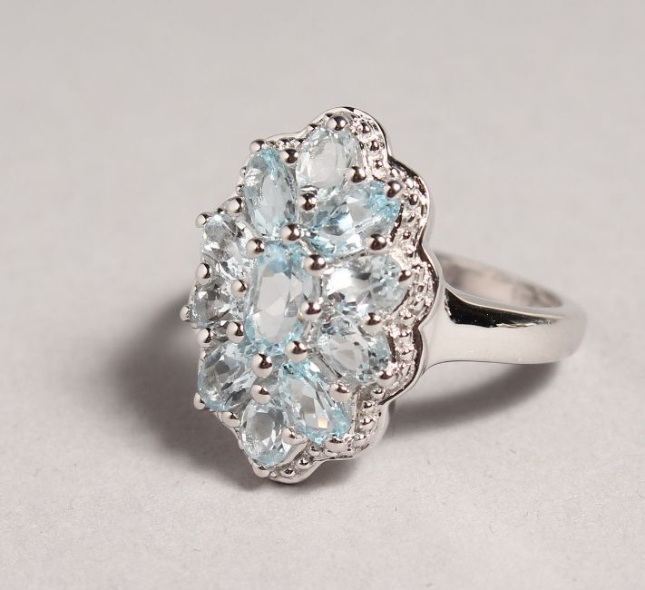 A SILVER AQUAMARINE CLUSTER RING.
