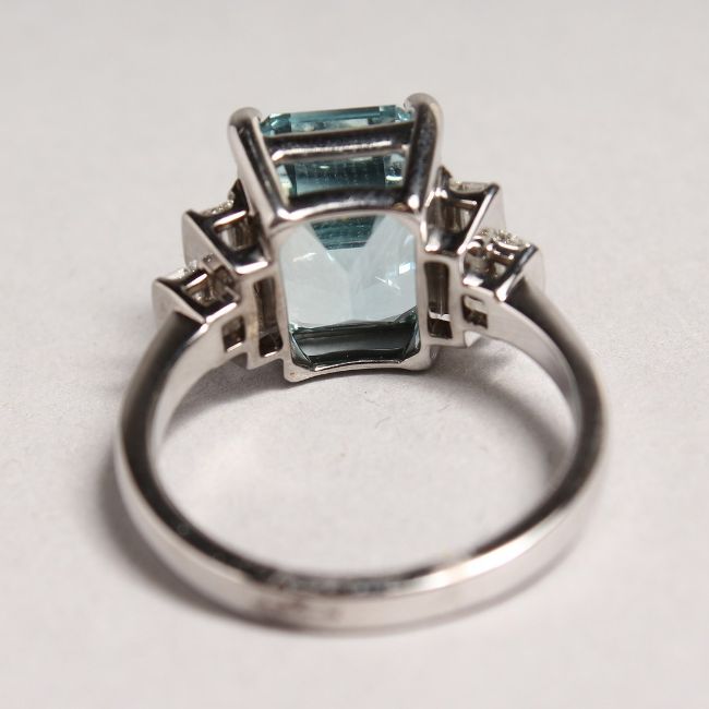 A SUPERB 18CT WHITE GOLD AND 5.5CT AQUAMARINE DECO DESIGN RING.