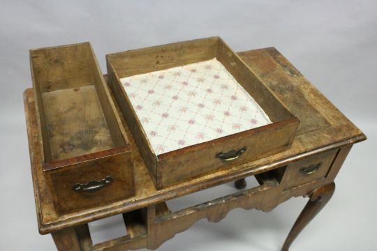 AN 18TH CENTURY WALNUT LOW BOY, with a crossbanded top, three drawers above a shaped apron, on cabriole legs with pad feet.
