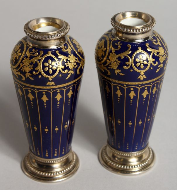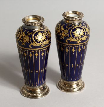 A SUPERB SMALL PAIR OF LIMOGES GILT DECORATED AND SILVER VASES.