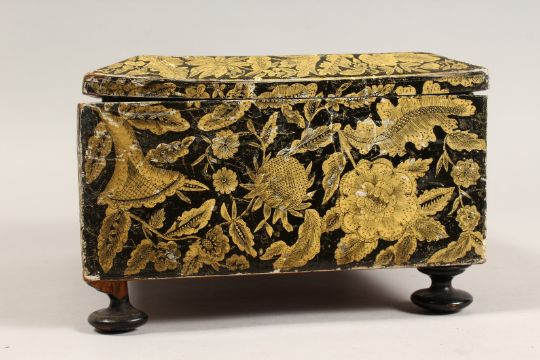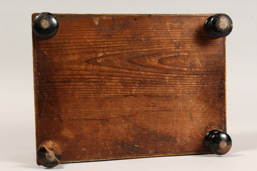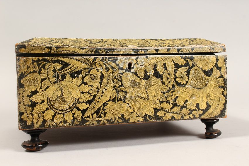 A REGENCY POKERWORK JEWELLERY BOX with fitted interior on four bun feet.