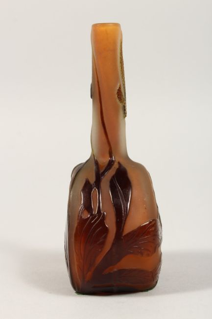 A SMALL AMBER GLASS BOTTLE, etched with a locust and flowers, signed Galle.