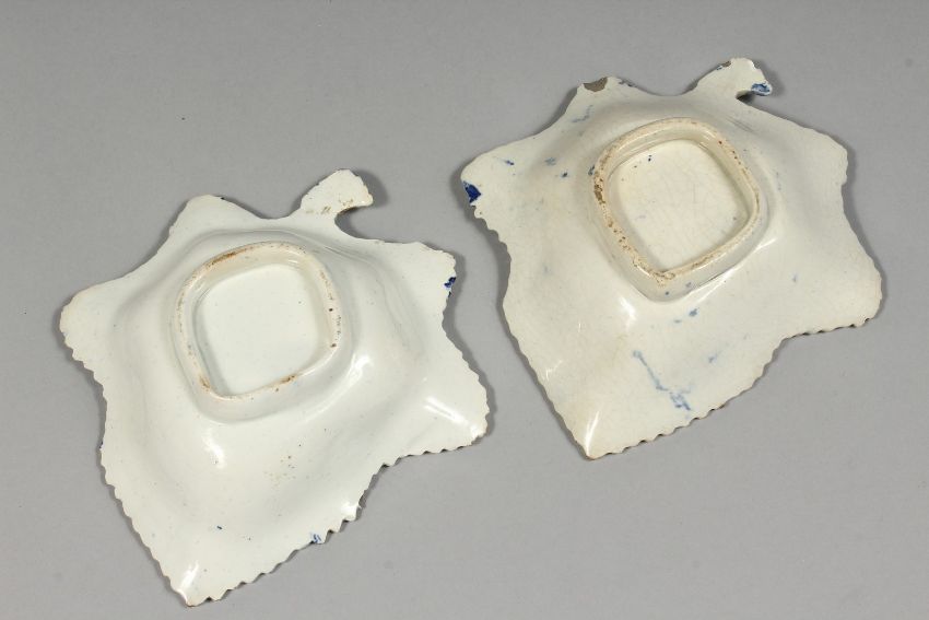 A PAIR OF STAFFORDSHIRE BLUE AND WHITE LEAF SHAPED PICKLE DISHES
